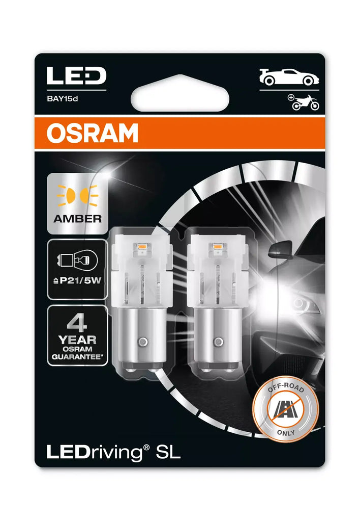 LEDriving SL P21/5W replacement lamps offer a modern and intense light. These replacement lamps are suitable for all conventional P21/5W lamp bases. In comparison to standard lamps, these LED retrofit lamps use up to 80% less energy. OSRAM offers a 4 year guarantee for these LEDriving SL lamps. These products do not have ECE approval and must not be used on public roads in any exterior application. Public roads use leads to cancellation of operating license and loss of insurance coverage. Several countries forbid sale and use of these products. Please contact your local distributor for further information.